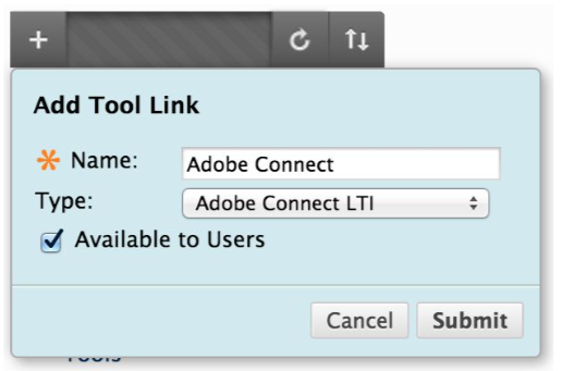 Enter a Name (Adobe Connect), and select Adobe Connect LTI from the Type drop-down menu. Select the Available to Users checkbox.