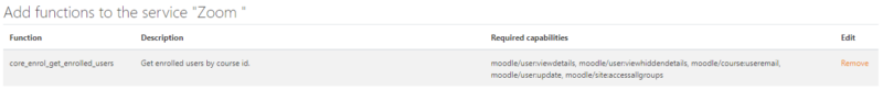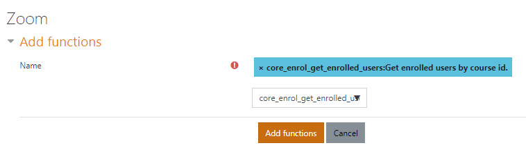 In the search field, search for the following function: ‘core_enrol_get_enrolled_users,’ and then click on it until it’s added as a blue box next to ‘Name’ (see screenshot below):