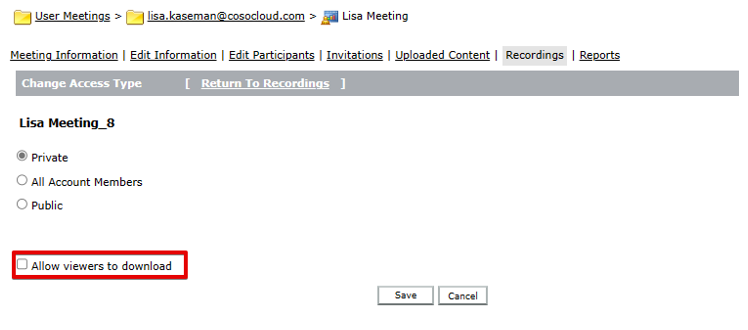 - Go to the meeting in Connect Central > Recordings > Access Type