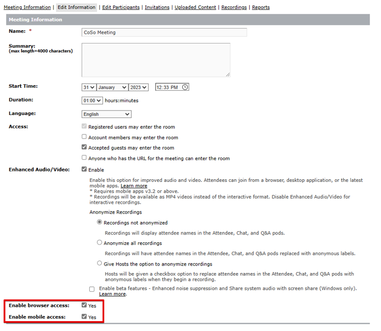 - Hosts can now restrict mobile and browser users from joining Adobe Connect meeting rooms. To enable browser and mobile access, locate the meeting room in Adobe Connect Central > edit information.